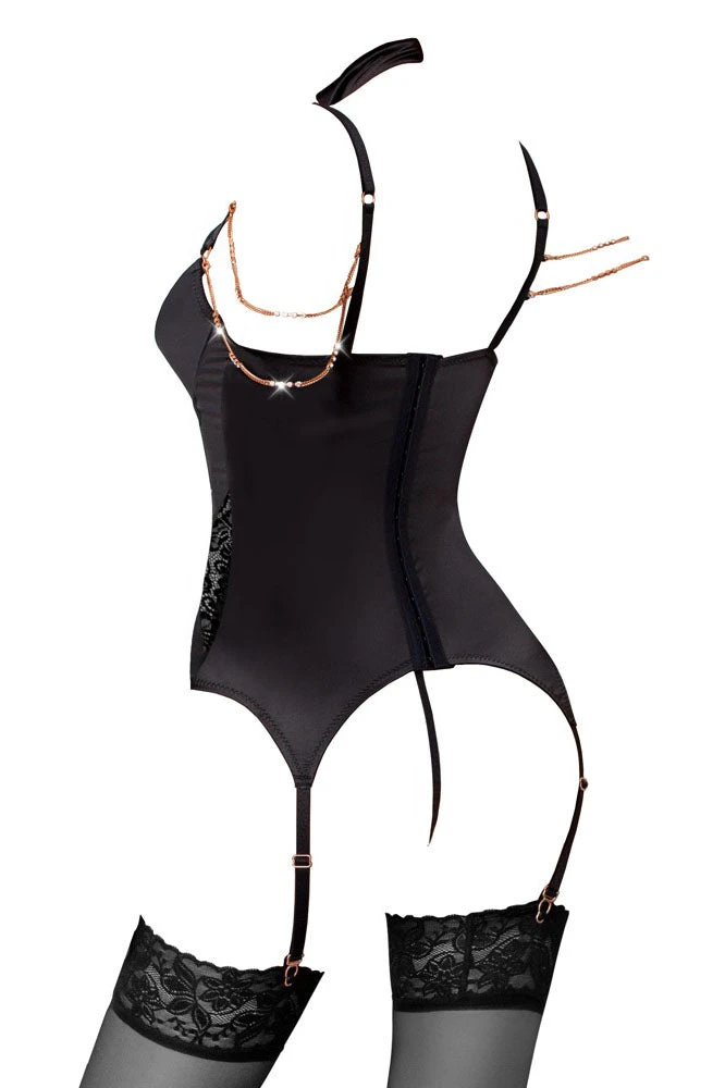 Sensational basque from von Abierta Fina made out of stretchy satin that has lace inserts that go down the basque and rose-gold coloured decoration. The integrated underwired shelf bra with slightly padded cups emphasise the beautiful breasts and make them the centre of attention. The two adjustable cleavage straps are fancy because they go from the adjustable bra straps to the choker. The choker has a hook and loop fastener. The chains over the breasts and shoulders are decorated with rhinestones and have snap hooks which means that they are removable. The small crotchless string made out of stretchy satin and a removable chain over the crotch is included.