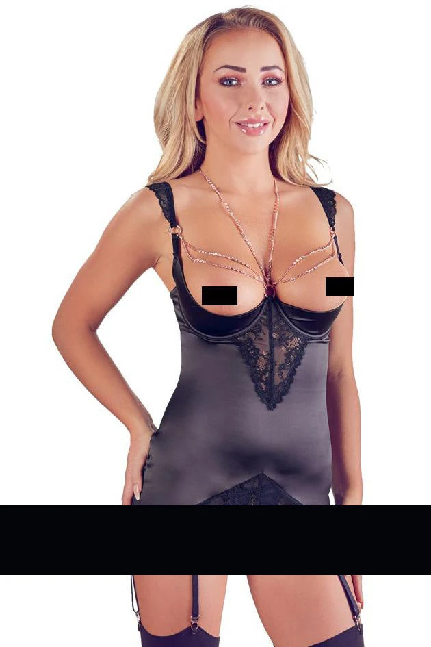 Seductive sight and a beautiful look! This sensual basque with a shelf bra has adjustable and removable suspender straps, and slightly padded, underwired cups. The basque also has a hook fastener at the back. With fancy lace details and elaborate rhinestone decoration in the cleavage area. The rhinestone decoration runs up three thin little chains on both sides. The chains go over the breasts and also go right up to the neck in a halterneck style. There are also additional lace inserts on the front of the basque, on the straps and on the hem. The matching string is crotchless and invitingly open. It also has a little chain that sensually stimulates with every step taken. This chain can be removed thanks to the snap hook – just like the chains on the basque itself.