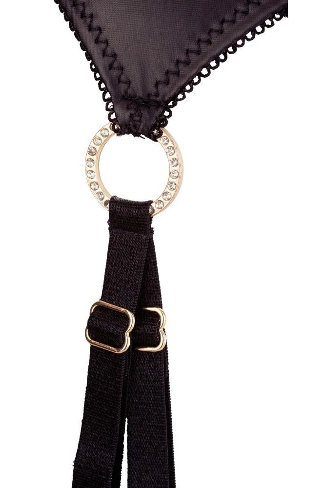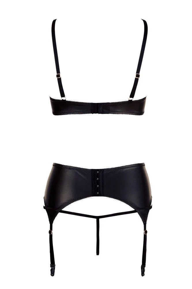 A beautiful design with gold-coloured details! The black underwired bra with a hook-fastener at the back perfectly emphasises your feminine assets. There are straps above the slightly padded cups that frame your breasts beautifully. The matching suspender belt also has a hook-fastener at the back and the decorative lacing at the front is very eye-catching. It also has two suspender straps per side at the front and one suspender strap per side at the back. All the straps are adjustable and therefore provide the perfect support. The included matching string is open in the crotch area and adds the finishing touch to this set.