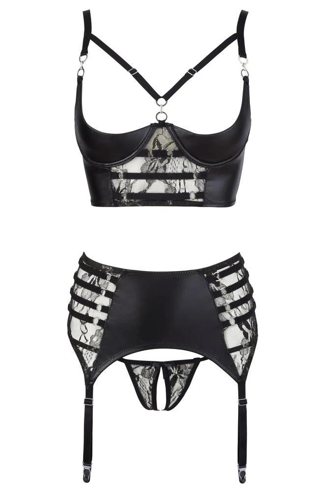 Glamorous design for erotic moments! Three-piece suspender set with breathtaking details. The bustier with slightly padded shelf bra perfectly emphasizes your breasts – sensually enclosed by delicate strap details and beautiful ornamental rings in the cleavage area. The matching suspender belt and the inviting crotchless briefs complete this erotic ensemble. The hook fasteners at the back and the adjustable bra straps provide high wearing comfort. With 2-coloured floral lace and elaborate lacings at the bustier and suspender belt.