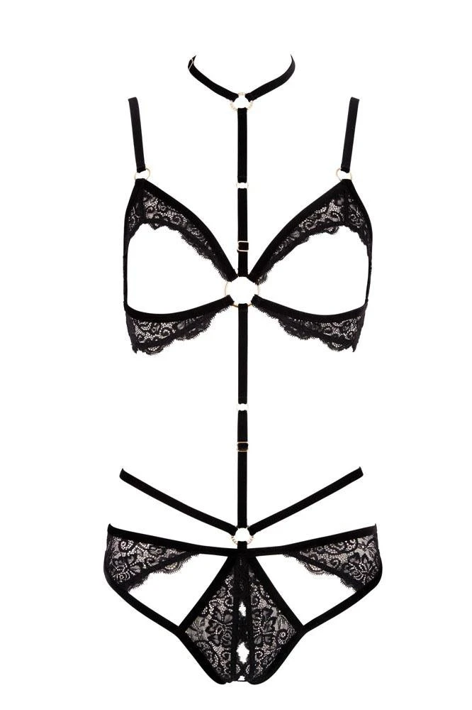 A breathtaking view – even during sex! The black body is extremely revealing because it is made up almost entirely of velvet straps that frame your curves in an elegant way. The straps can be adjusted so that the body fits perfectly and is comfortable to wear. The delicate lace from the open cups decorates your beautiful breasts and the crotchless briefs also have lace inserts as well. The numerous gold-coloured details like the ring (with decorative rhinestones) on the choker and the briefs add that little extra decoration to the body.