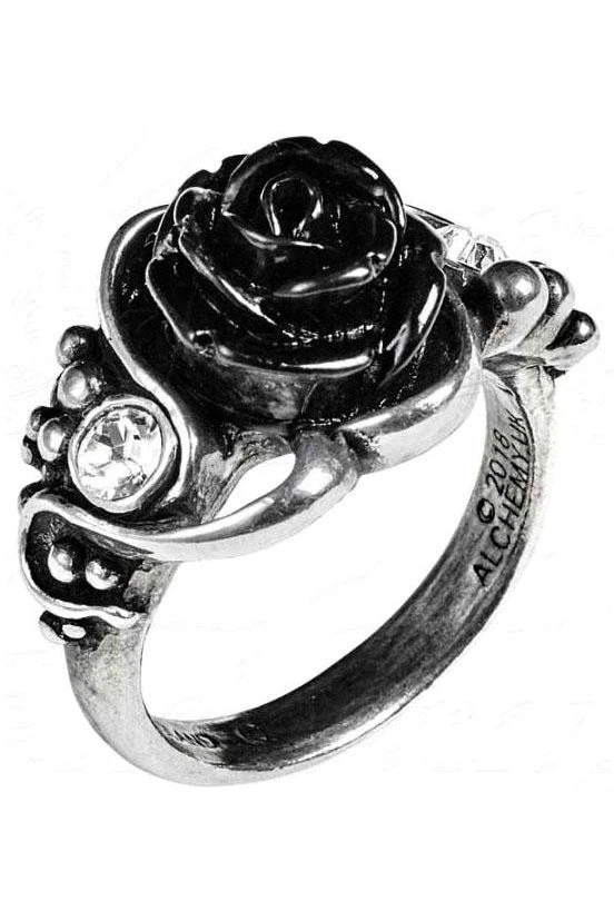 A romantic motif concealing a secret libertine passion for wine and sensual pleasures. An intoxicating combination of the black rose of dark desire and the grapes of hedonism. Polished pewter rose and grape vine ring, with black resin rose at its centre and a clear crystal Swarovski gem either side.