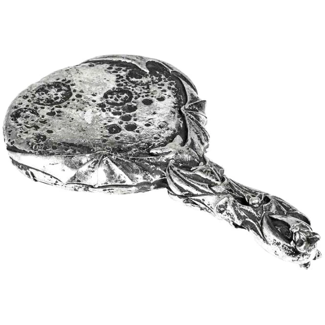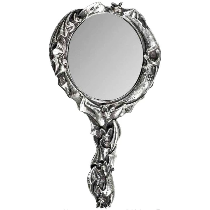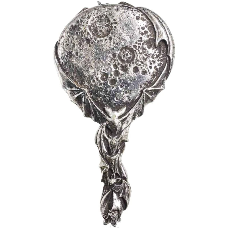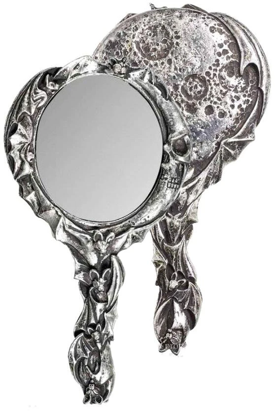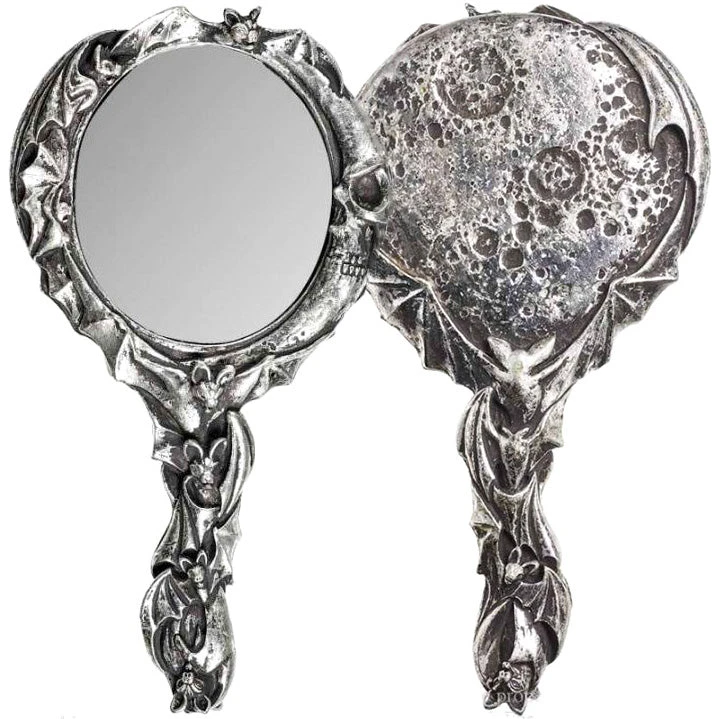 Denizens of midnight take flight on a nocturnal foray to feast on hot blood, before returning to their sanctum on the dark side of the moon. Bats and Moons grace this stunning Gothic hand mirror. A darkly stunning addition to your crypt!
