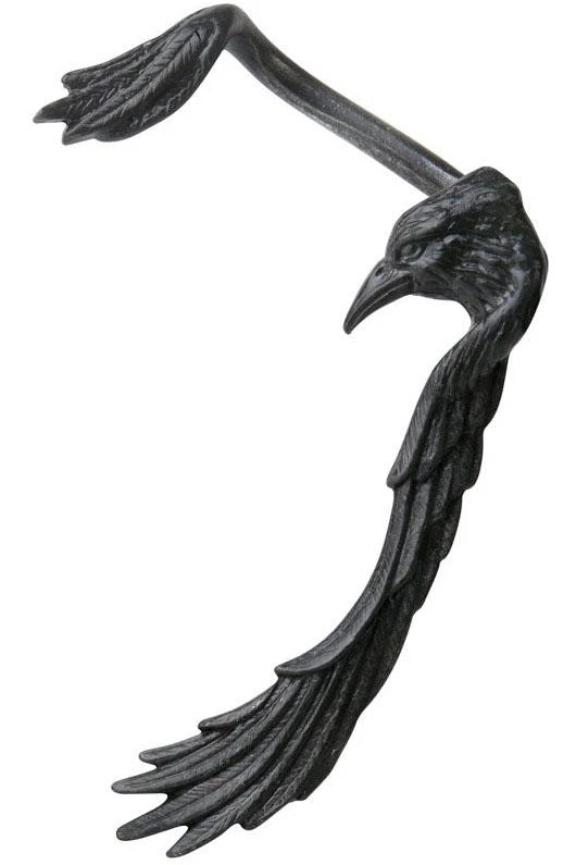 Like a personal tutelary, ready to impart its supernatural intelligence to its master and invoking uncanny powers of protection, the black raven raffishly embraces the ear of its owner. The black wings and head of a pewter raven are visible as they wrap around the outside of the left ear. Fastened by a surgical steel ear-post at the bottom and the adjustment of the upper wing by gently bending to fit.