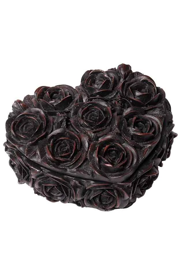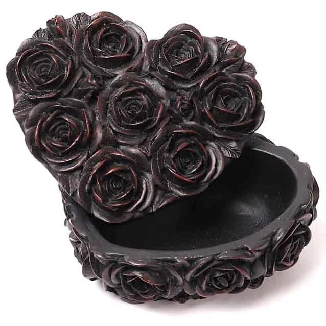 A delicate rose detailed, heart shaped trinket box. The perfect place for treasured keepsakes to hide.