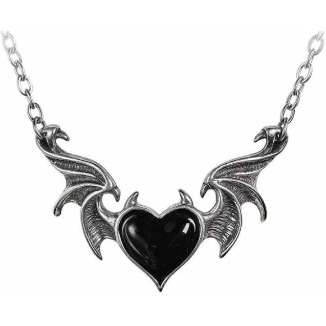 The black demon heart of a gothic seductress, nocturnally enticing her prey with ravishing enchantment. A dark statement piece for every day wear. An enamelled black heart with horns, between the outstretched flying wings of a demon.