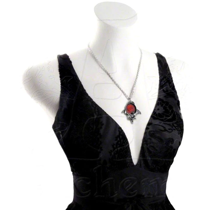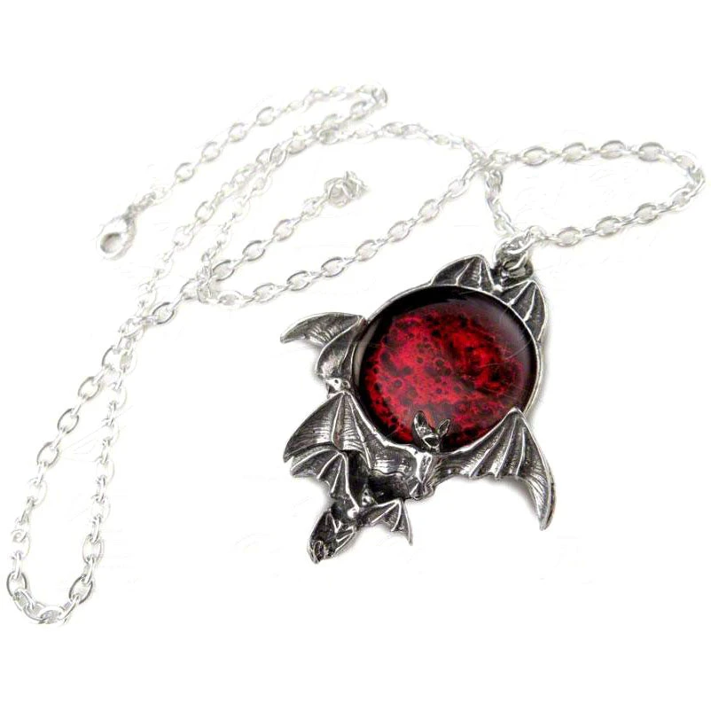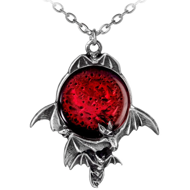 A skein of bats flitters about this deep and sinister portent.A dramatic necklace fit for a vampire king or queen. A pewter pendant of the moon, in translucent red enamel and surrounded by flying bats.