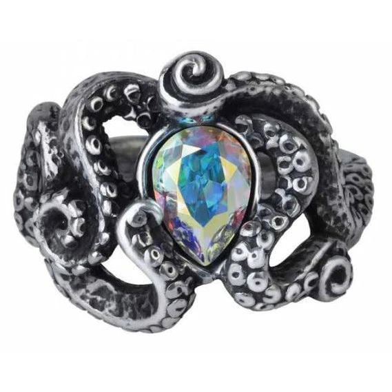 A highly detailed kraken/squid tentacled ring set with a Swarovski crystal heart in a white rainbow effect.