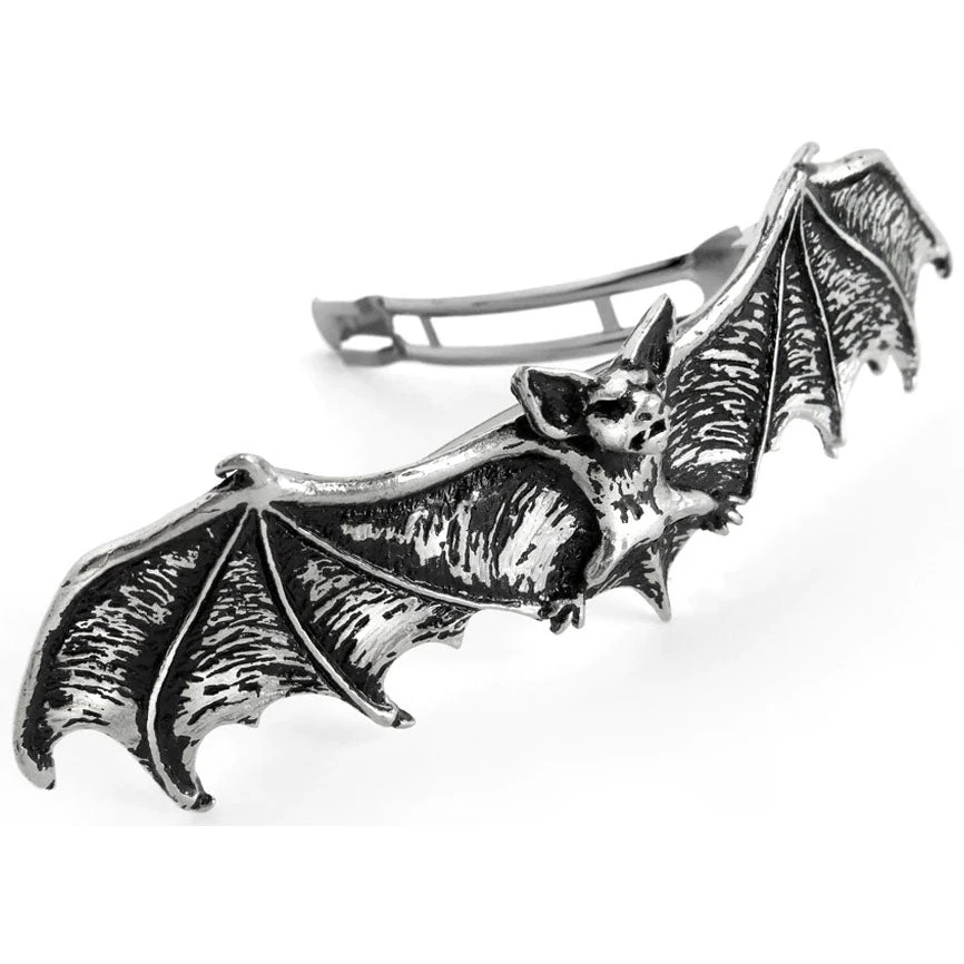 The classic vampiric bat swoops spread-eagled towards it’s prey. An elegant gothic hair accessory with timeless appeal. Pewter bat hair slide with standard spring steel hair clip.