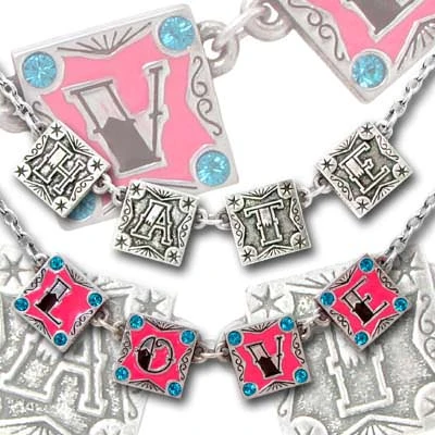 Articulated, enameled & Swarovski crystallized necklace, declaring “LOVE” on the front and “HATE” on the reverse. On split trace chain.