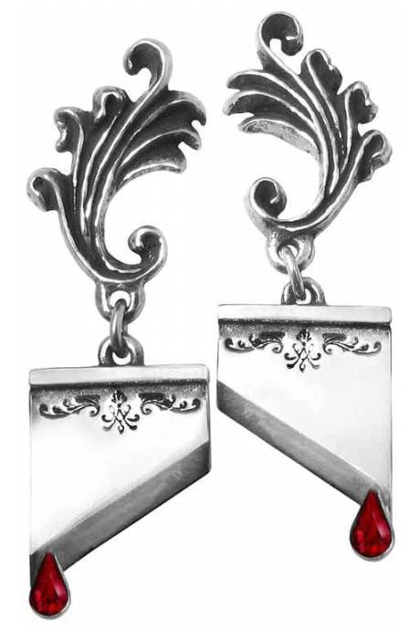 Flaunting the regal finesse of a doomed age, miniature guillotine blades, bear the last traces of aristocratic life; with Swarovski crystal blood drops. A macabre piece that drips with gothic elegance. A pair of guillotine blade, dropper ear-studs with Swarovski crystal blood drops and surgical steel ear-posts.