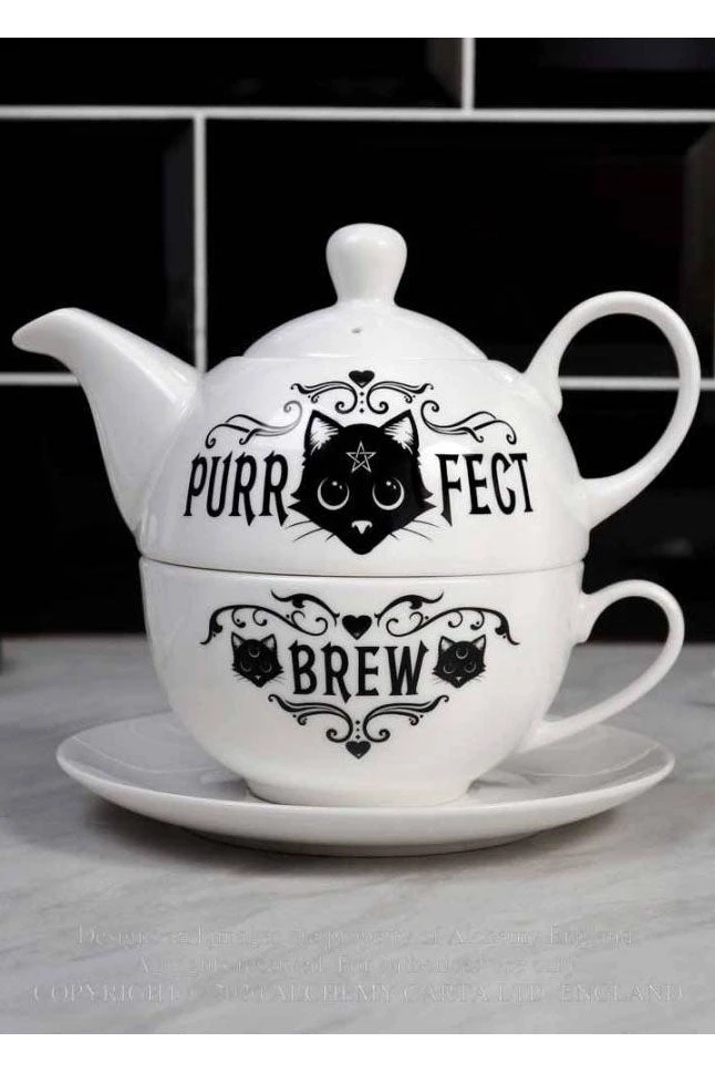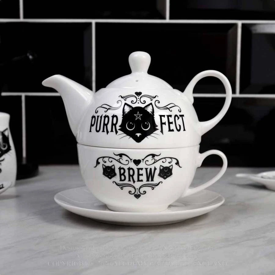 A beautiful, high quality, fine bone China, ‘Tea For One Set’. The set consists of 3pcs and includes everything you need to brew your perfect cup of tea. Just add a tea bag and water! It is ideal for guest use when brewing an individual flavoured or herbal tea. Or would certainly make the perfect unique gift for your tea loving friend. The set presented in a beautiful gift box. This set features the ‘Purrfect Brew’ design.