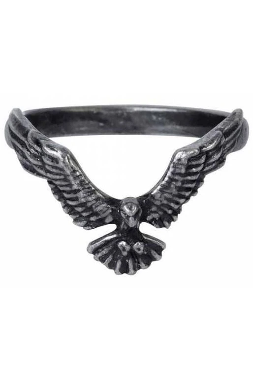 A delicate, shallow ‘V’ shaped, flying, spread-eagled black raven wrapping around the top part of the finger, before turning into the shank.
