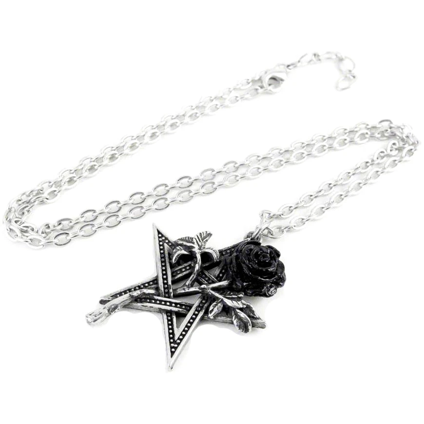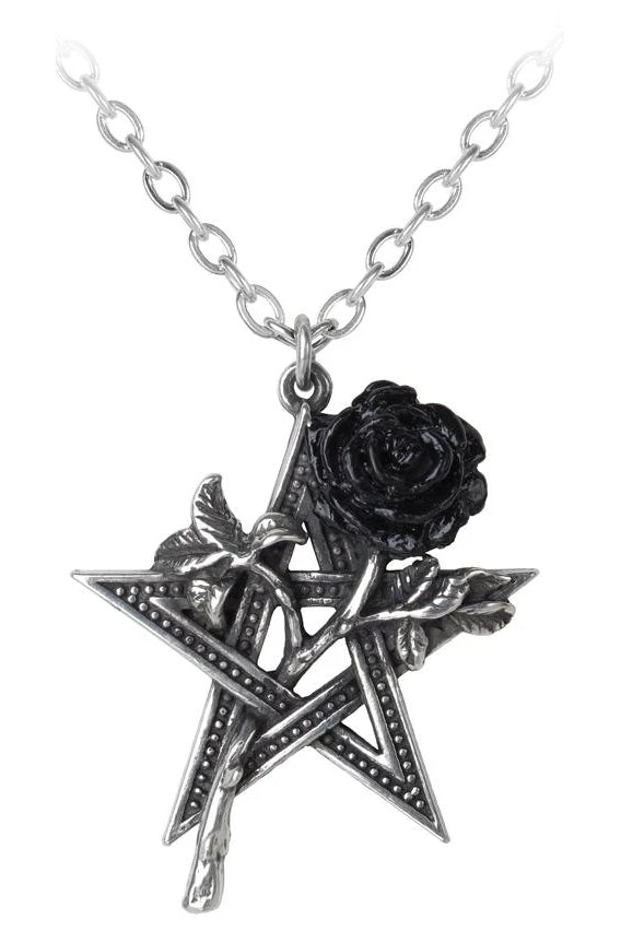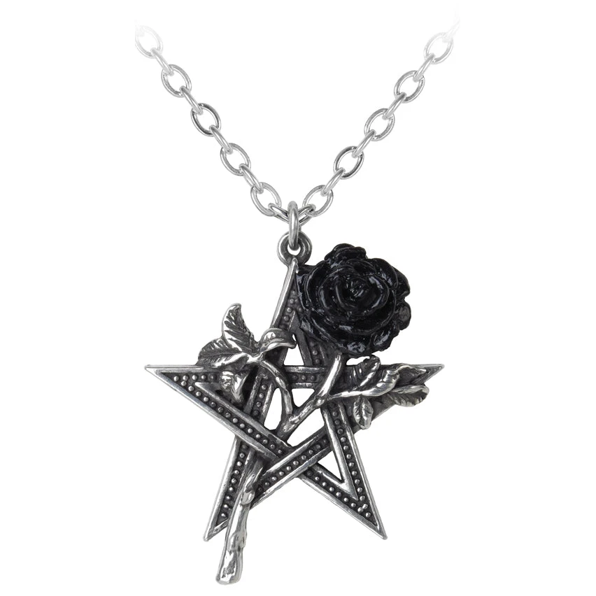 The pentagram is the fifth element; the spirit and the ‘Breath of Life’, passionately entwined with the romantic and sensual rose of faithful love to ensure health, harmony and Erosean mystical powers. A detailed pewter pentagram entwined with a black petalled rose. On a 21″ trace chain.