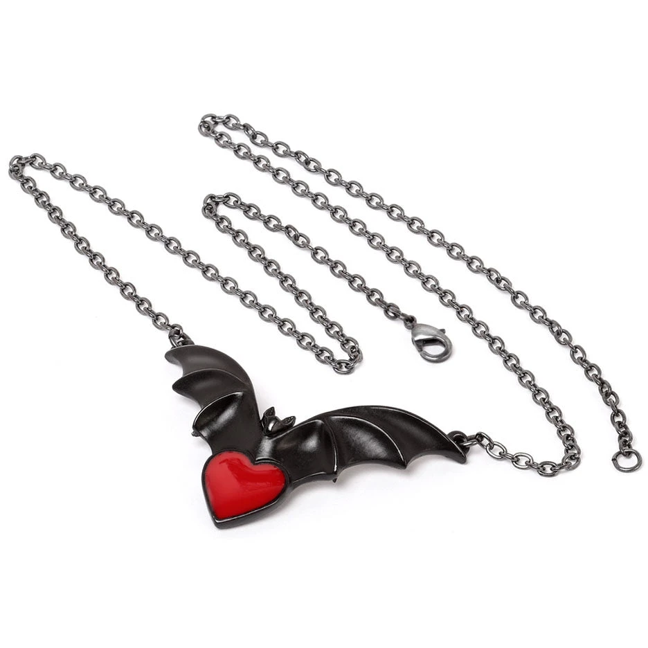 Oh but to resist these wicked desires! Show your darkest love for the creature of the night with this striking pendant. A striking bat pendant, in blackened pewter with a blood red enamel inlaid heart.