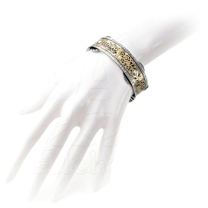 An early scientific instrument band of The Enlightenment, for controlling moonlight wavelength emulations. A unique bracelet for steampunk enthusiasts. Antiqued pewter bangle with solid, polished brass etched inlay.
