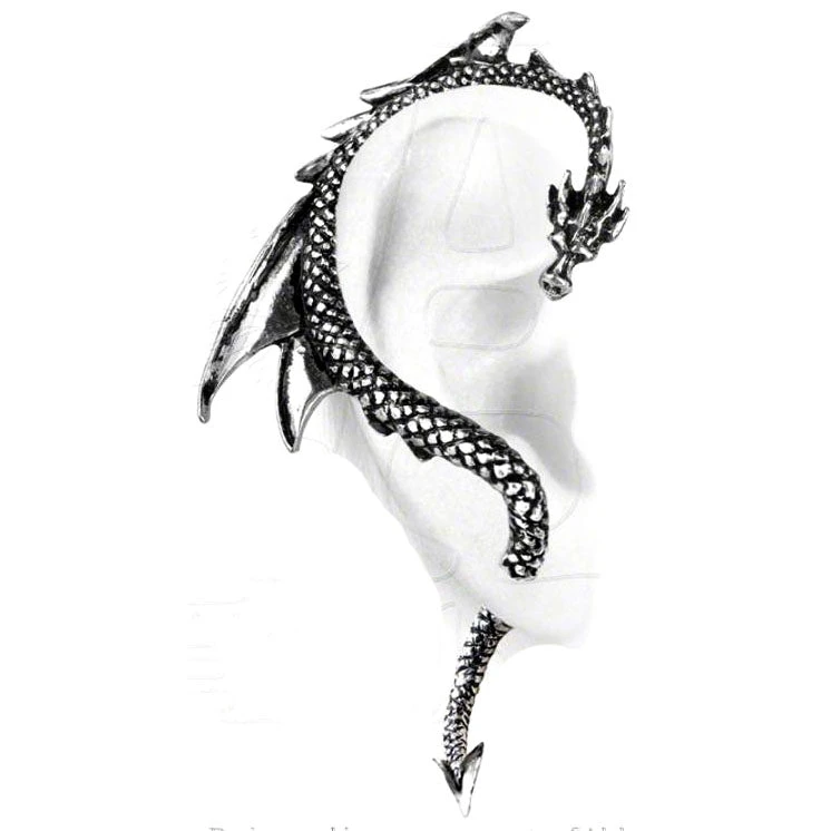 Like a whispering shoulder devil or a witch’s familiar, this tortuous, personal miniature dragon, piercing through the ear lobe, tempts the wearer into acts of shameful depravity. An eye-catching ear stud that’s sure to make an impact. Faux-stretch piercing pewter dragon ear-wrap, with surgical steel ear-post.