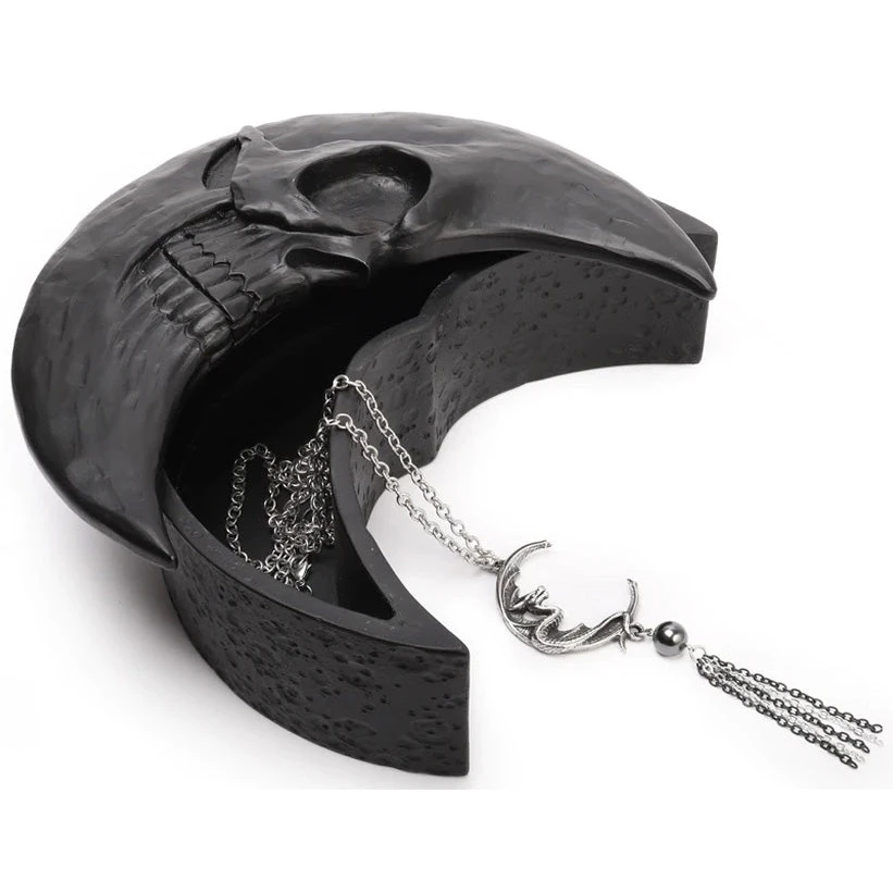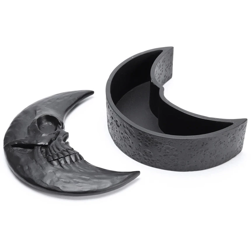 A moon shape casket with skull face. Hand finished, high quality poly resin.