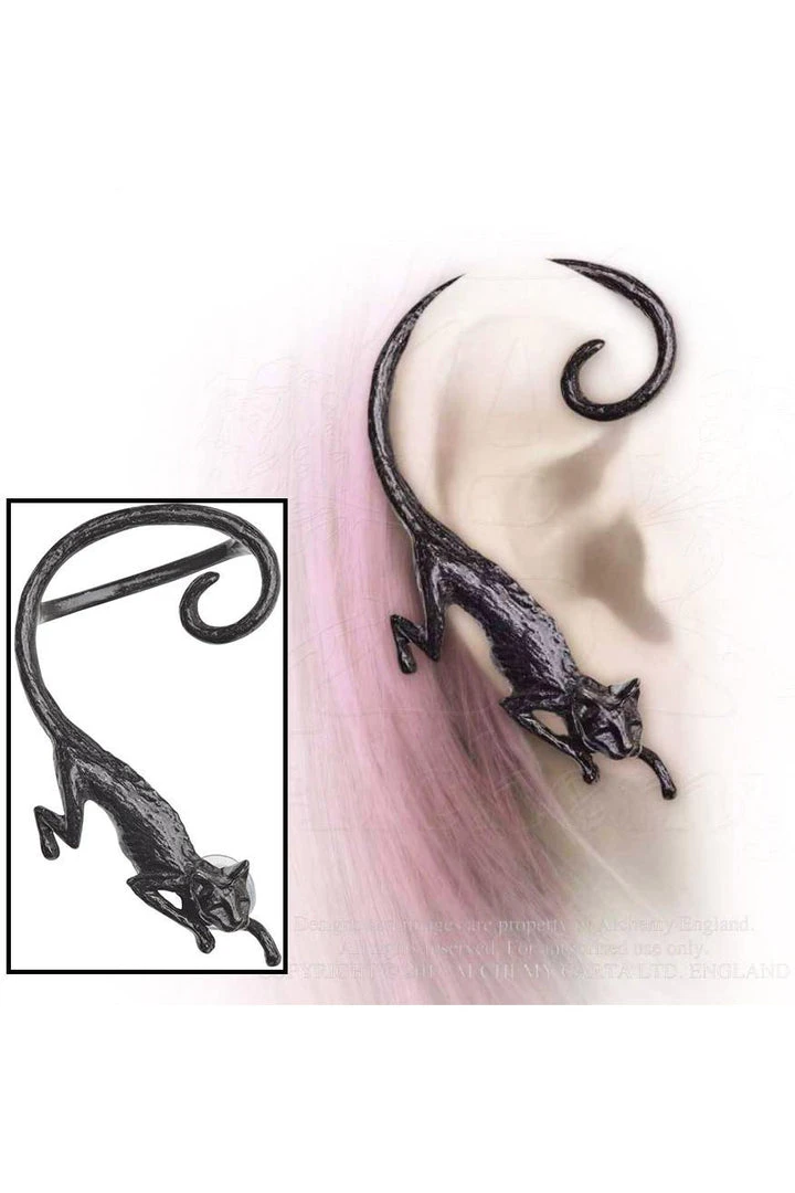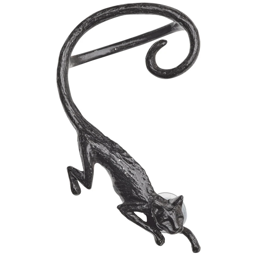 Superstition and folklore pervade the mysterious black cat. Known in Celtic mythology as the fairy Cat Sith, a black cat could be a witch’s familiar, or may court many suitors for its desirous companion. A fully 3D modelled, black pewter cat ear wrap crouched in a stalking position with its long tail wrapping around the top of the ear; surgical steel ear-post for the lobe.