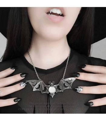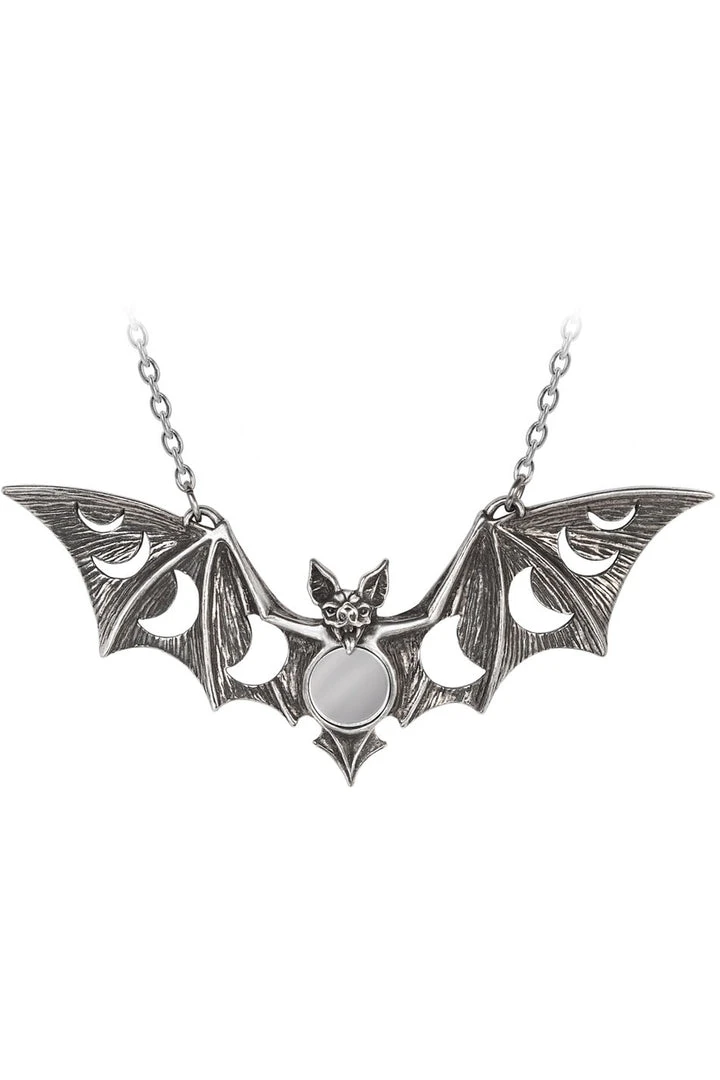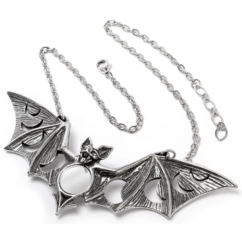Spirit of the night, invoked by devotion and conjured from the Temple of Isis. Be the envy of all whilst wearing this incredible necklace! A bat shaped necklace with moon phase cut out and inlaid mirror centre piece.