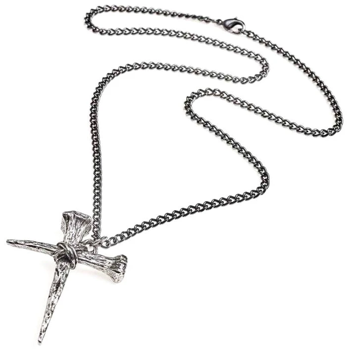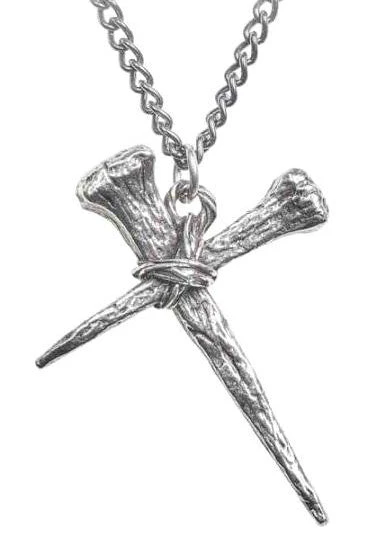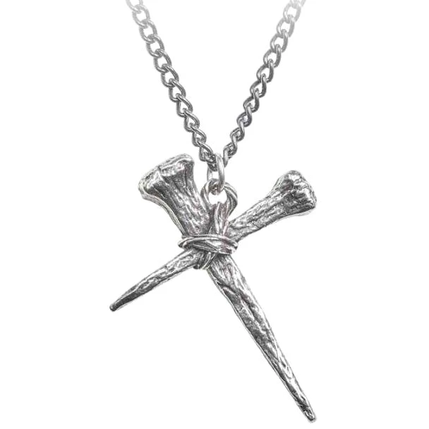 Commitment to faith can lead to brutal consequences. Hard as nails Metal Wear. An obliquely hung pewter cross pendant formed by two primitive iron nails bound as a cruciform.