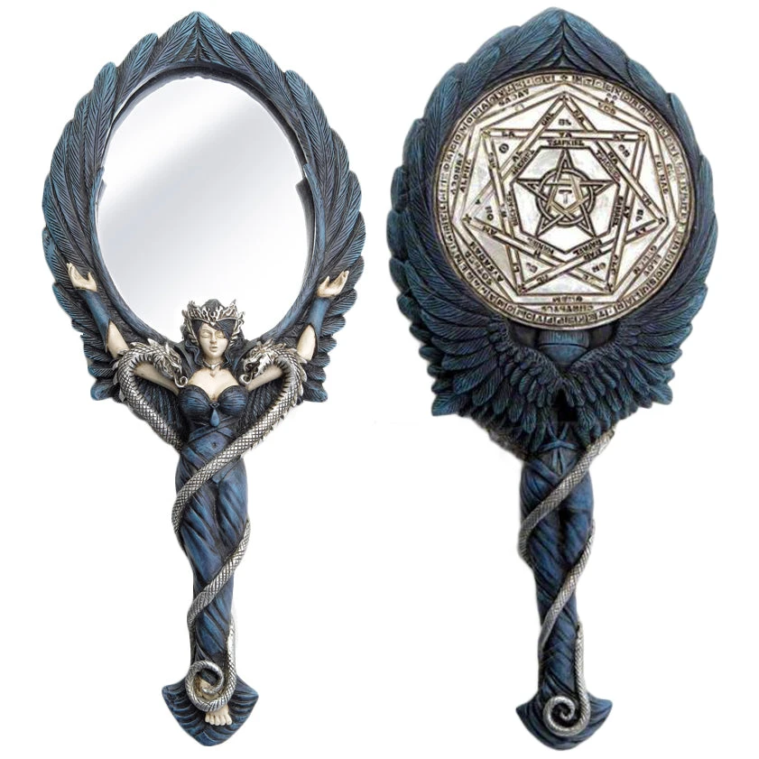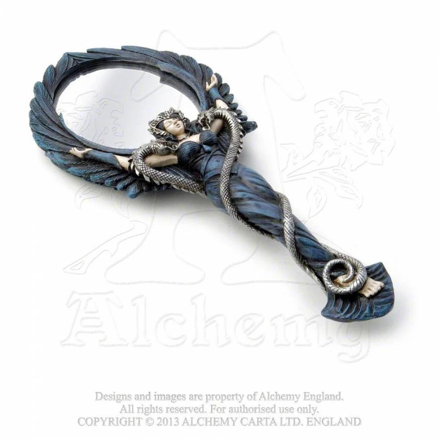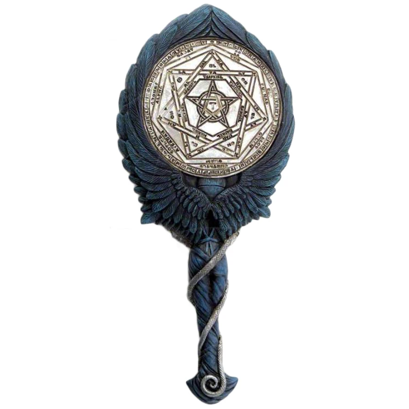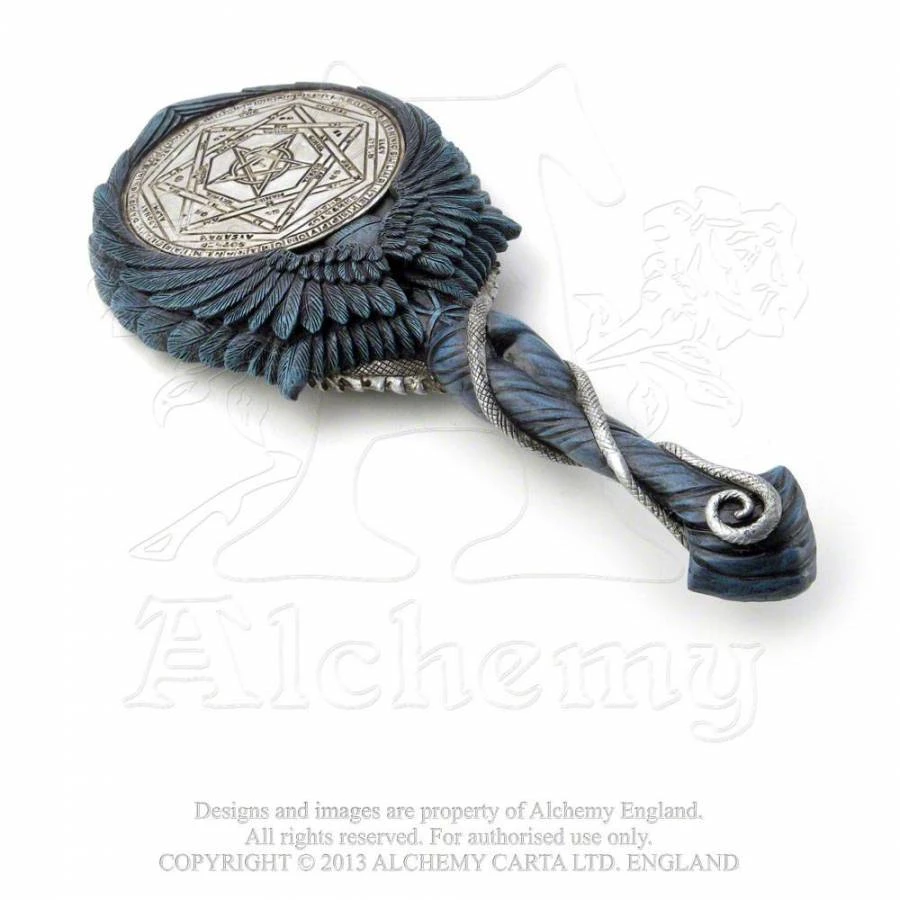 One of the most alluring of the high order of angels, invoked by the Sigilum Aemeth, Doctor John Dee’s scrying stone. An exquisite hand-held mirror for the gothic dressing table. A resin cast angel hand mirror with an oracle’s seal on the reverse; hand painted and with mirrored glass.