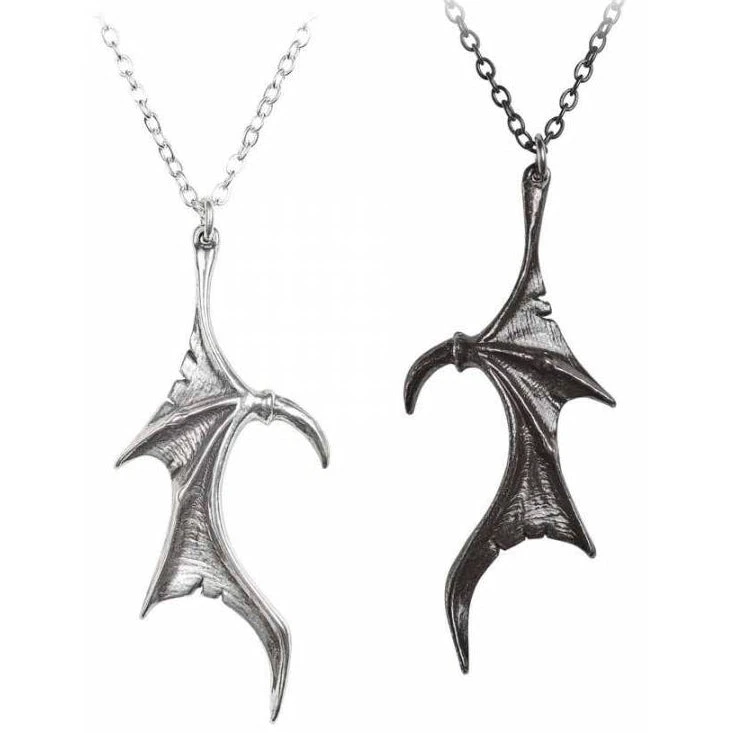 Two matching pewter pendants, one polished pewter, the other black pewter, of symmetrically opposite dragon’s wings which, when held together create the shape of a heart; each on fine 18″, (46cm), matching coloured trace chain.