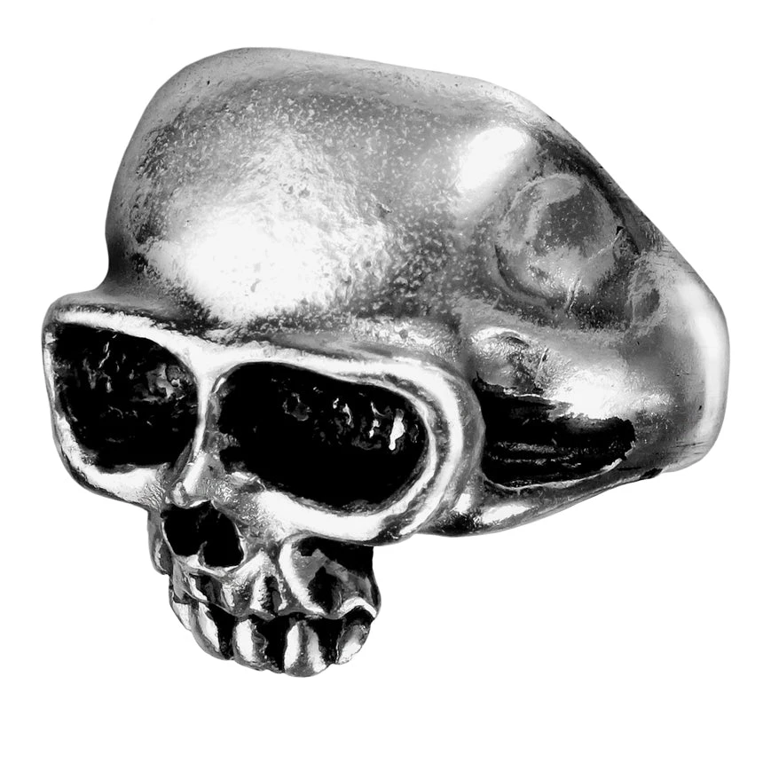 The most direct and manifest statement of attitude, the famous blank, stark expression of the face of death. A simple yet sinister piece of metalwear. The classic skull ring used by rock stars for over 30 years, in pewter.