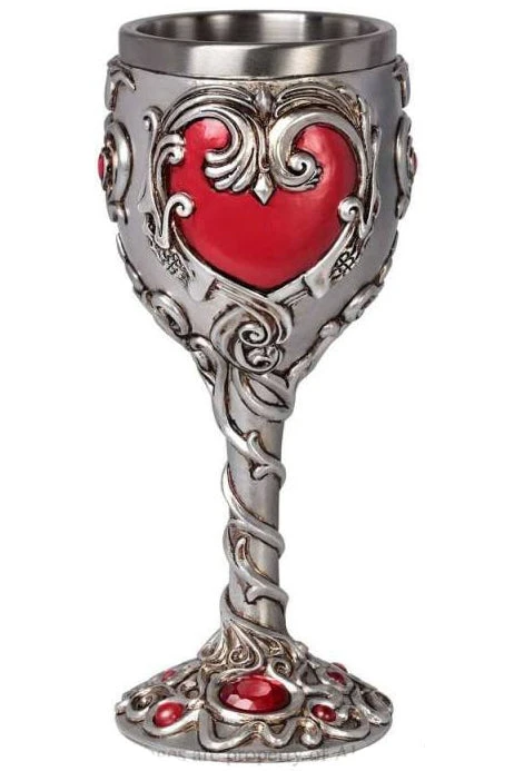An Affaire du Coeur – for love shall survive even death. A dark and Delphic romance of the heart between two strange and exotic creatures, affirming a bond that transcends our earthly realm and reaches unto the Elysium fields of eternity. A show piece for your home hand finished in finest resin with a steel cup inlay. A stunning hand painted goblet/chalice with skull, heart and vine detail. Inlaid with faux crystals and cabochons representing puddles of blood. To preserve the life of this goblet you must not dish wash or submerge in water. Cup can be wiped clean after use. Decorative item only.