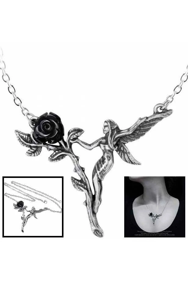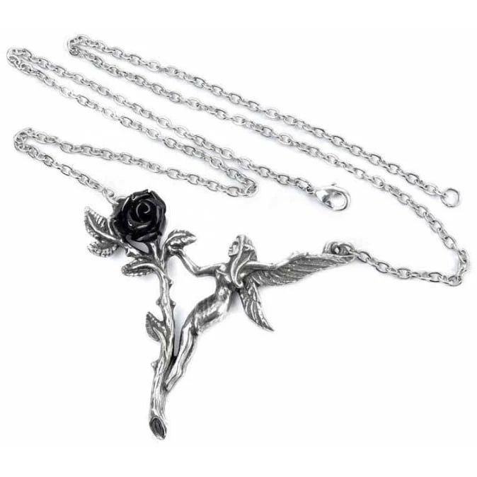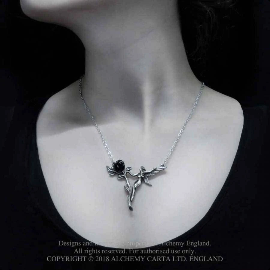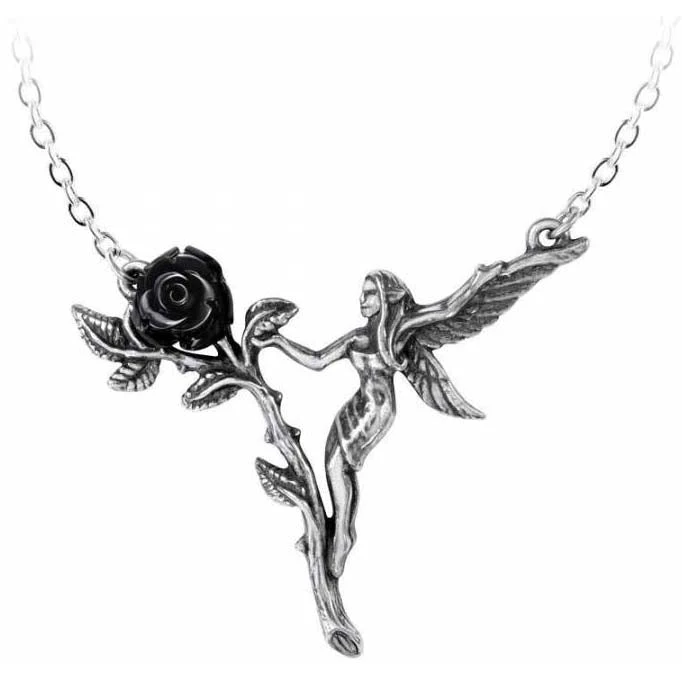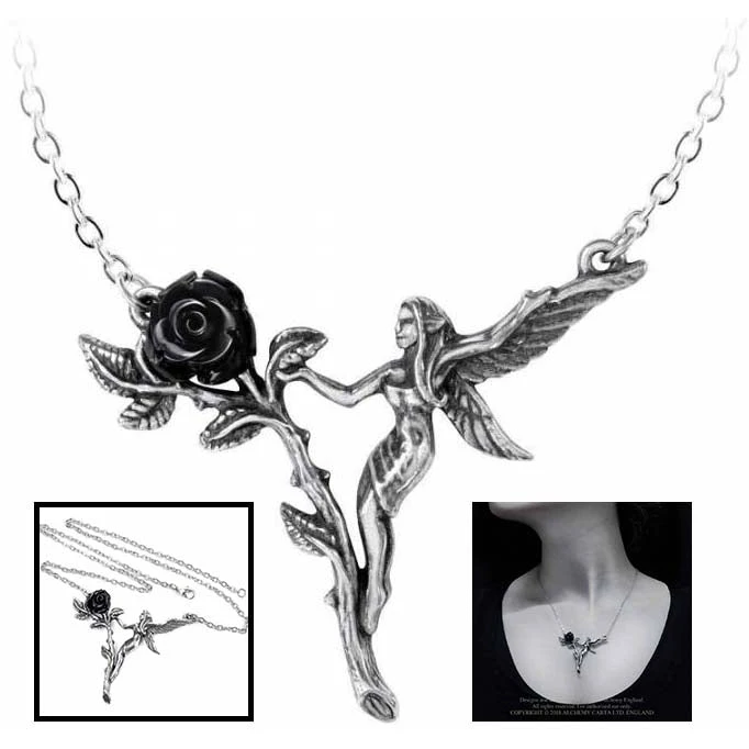 The ephemeral delicacy of a garden fairy reflecting the short but sweet life of a black rose. An intricate pewter pendant of a fairy capering around a single black rose, with a resin flower and on a 18″ (23 cm) long chain.