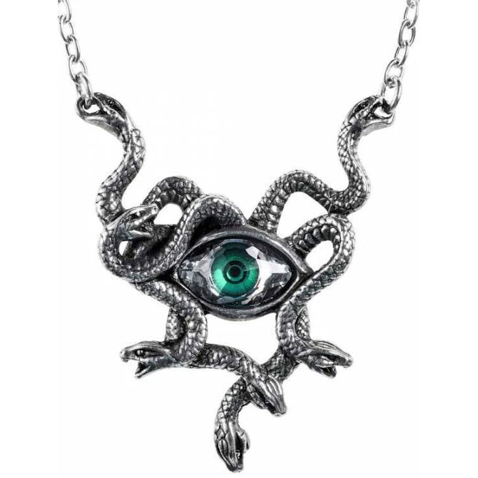 The very essence of the dreaded evil eye, staring from within the writhing snakes of the gorgon Stheno’s living tresses. Do not stare into this microcosm of malevolence, for mortal fear of being turned to stone! Add some mythical drama with this ‘eye’ catching piece. The pewter necklace of a tangle of writhing snakes centred around a Swarovski faceted crystal eye with emerald green iris.