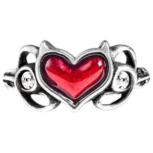 The heart of The Devil, to signify your love of the wicked! Bring out your ‘Little Devil’ with this naughty ring! A delicate pewter ring of a blood-red enamelled Devil’s heart flanked by two Swarovski white crystals.