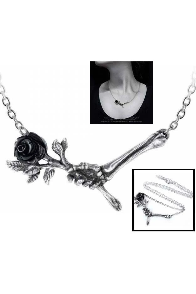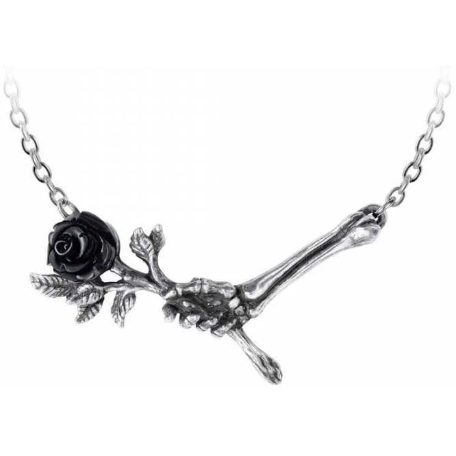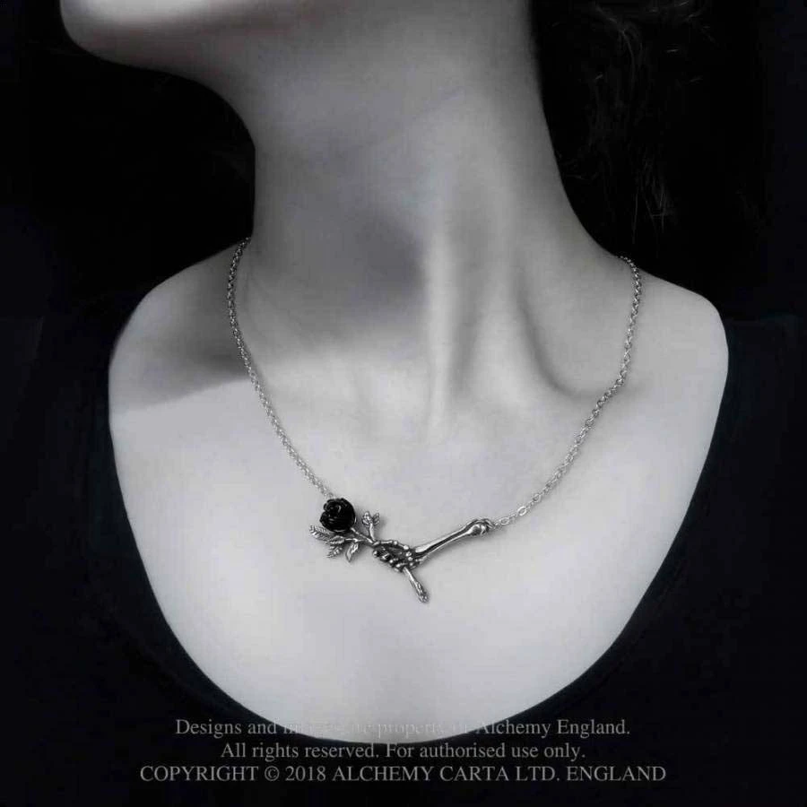 A fine pewter necklace of a skeletal hand offering a single black rose, with a black resin flower and on a split chain, 20″ (51 cm) overall.