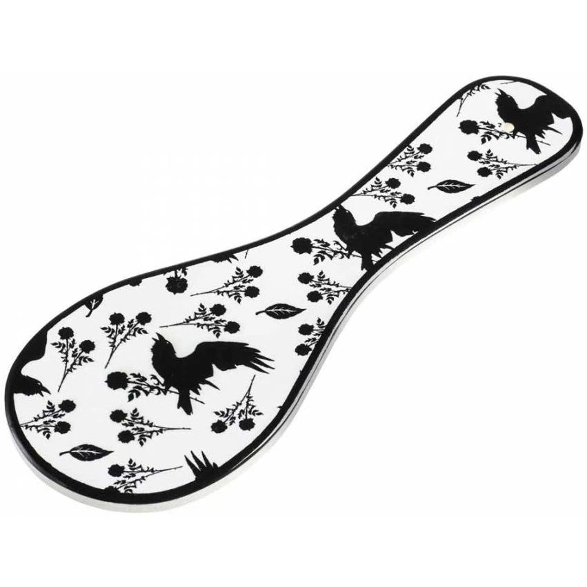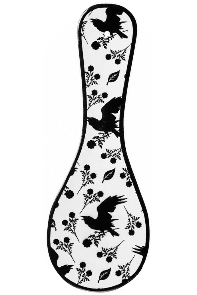A beautiful spoon rest decorated in the elegant Alchemy raven and rose design. This spoon rest will be a beautiful addition to your kitchen either by the hob or hanging on the wall. This darkly elegant design is also presented on a matching trivet/ chopping board and jigsaw coaster/ trivet set.
