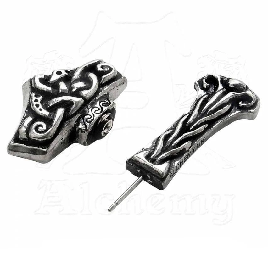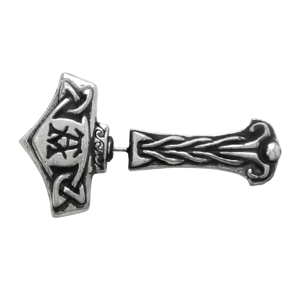 As if thrust insensitively straight through the earlobe, the richly decorated Nordic Thor’s hammer empowers its wearer both visually and spiritually. A stretched piercing effect pewter ear stud, appearing as a Hammer of Thor, carved overall with Celtic style knotwork, with surgical steel ear-post.