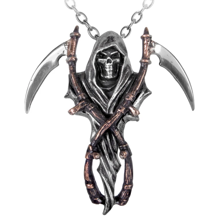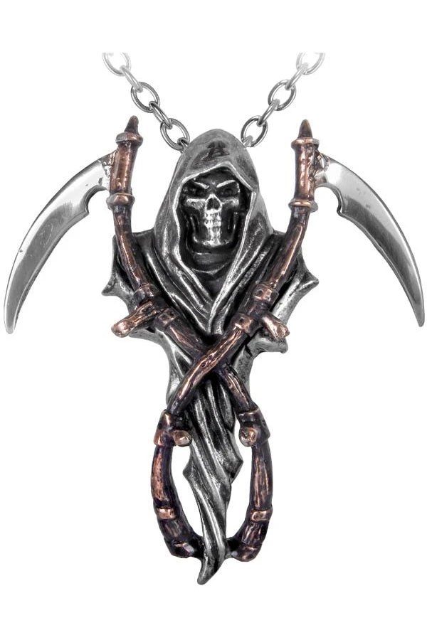 The crest of the angel of death, the Harvester of Sorrow, and the ultimate badge of fate. A classic piece of metalwear for the dark at heart. A two-tone pewter pendant of the Grim Reaper with bronzed scythe handles from Alchemy Gothic Jewellery.
