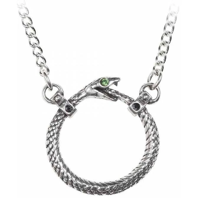A pewter serpent eternity ring pendant with a green Swarovski crystal eye.