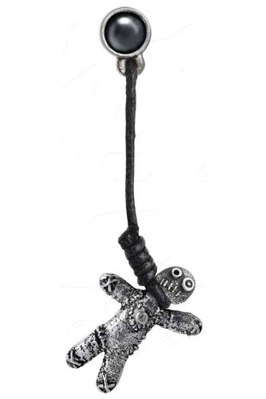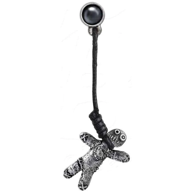 An antiqued pewter stud with black cabachon, from which is suspended a pewter voodoo doll on the end of a black waxed cord noose.
