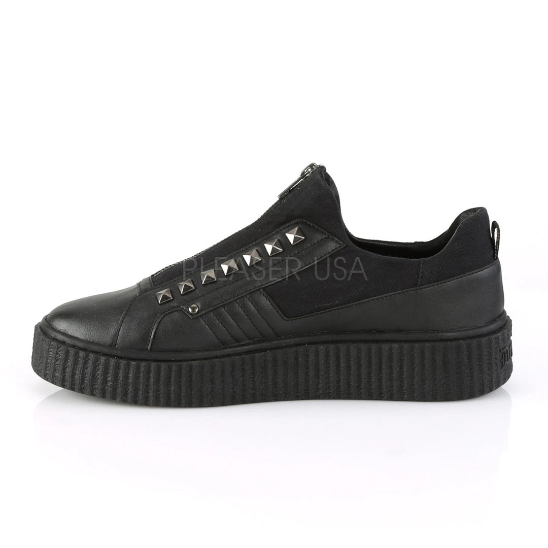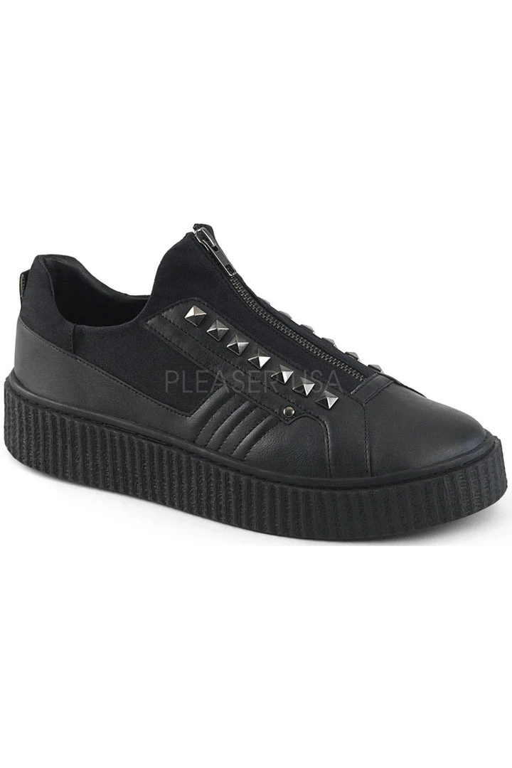 1 1/2″ (38mm) Platform Rubber Sole Low Top Round Toe Zip Front Creeper Sneaker Featuring Pyramid Stud Details Up the Front.