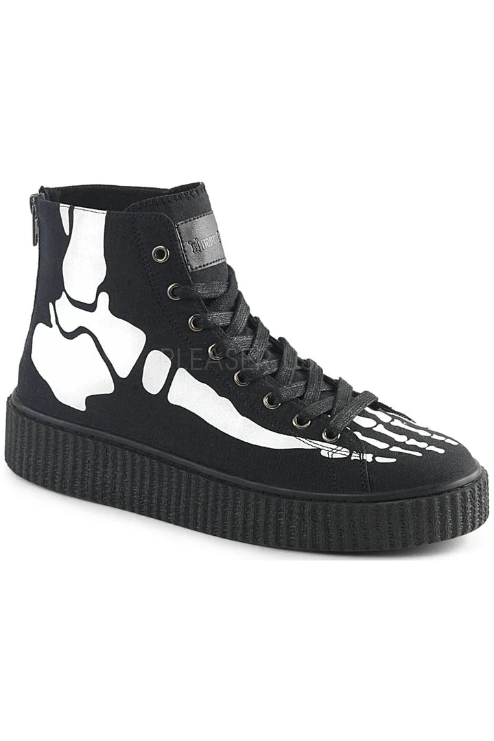 1 1/2″ (38mm) Platform Rubber Sole High Top Round Toe Lace-Up Front Creeper Sneaker Featuring Xray Bone Print, Full Back Metal Zipper Closure.