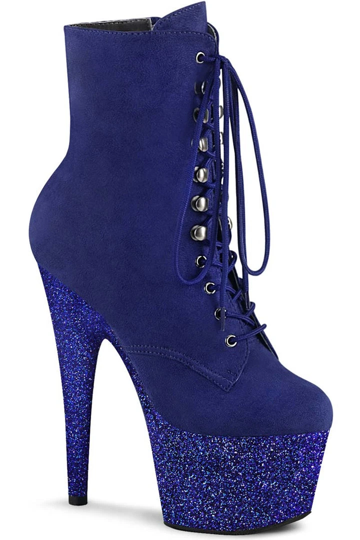 Pleaser Faux Suede ADORE 1020FSMG Blue Boots with Blue Multi Mini Glitter Heels.
