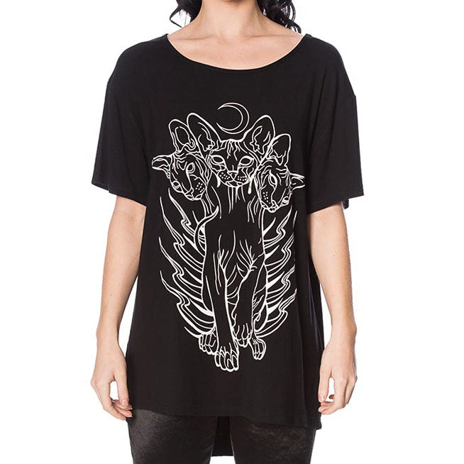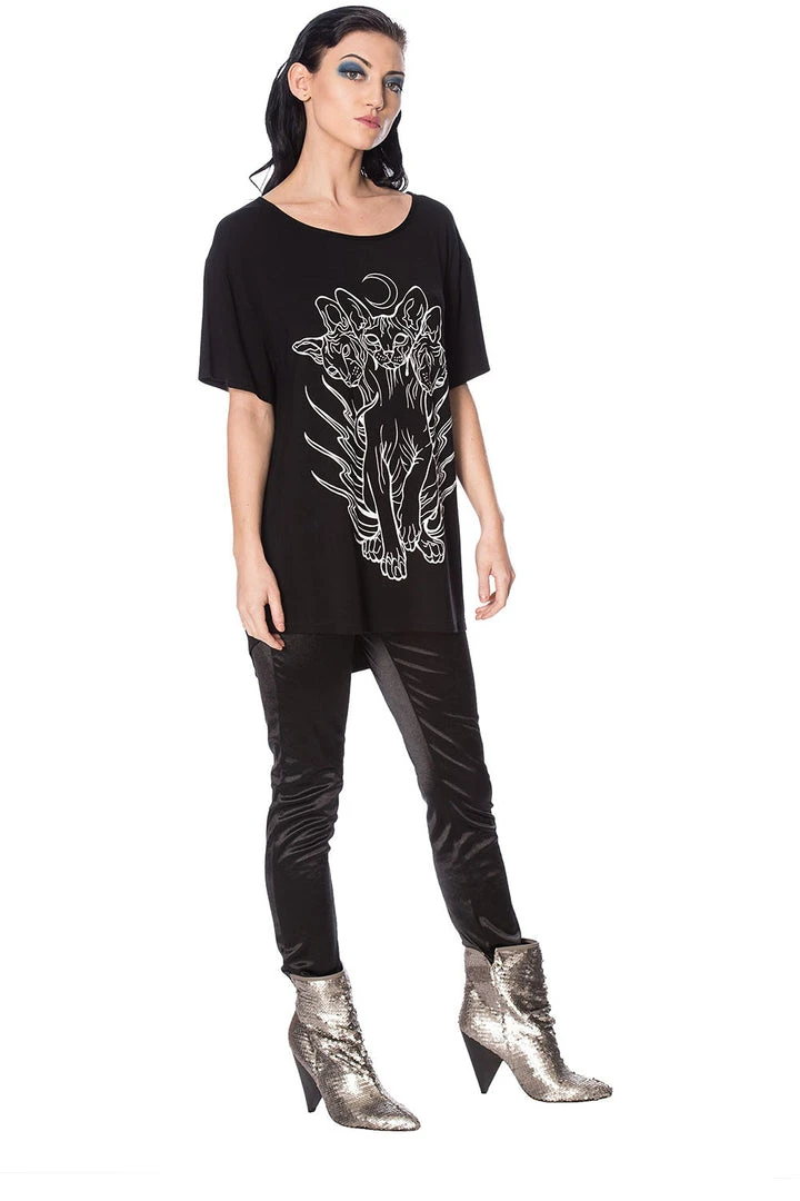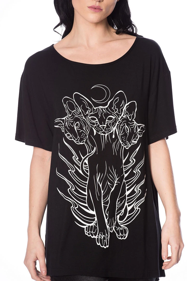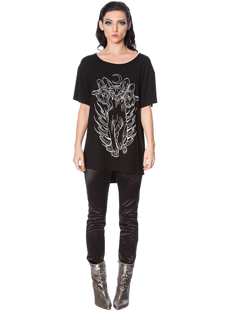 Banned’s cat version of Cerberus. An oversized relaxed fit top with screen placement print featuring a three headed cat.