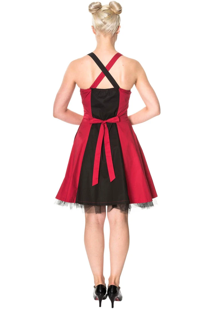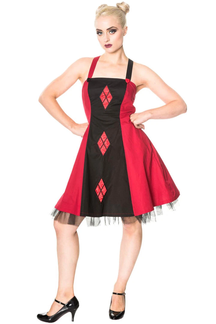 This fabulously cute black and red two tone cotton dress features harlequin style satin diamond pattern appliques down the front and heart buttons where the cross over shoulder straps join the front of the dress. There is a black net trimmed underlayer for added volume and the dress fastens with a concealed zip at the side. There is a red tie at the back of the waist for the most flattering waistline.