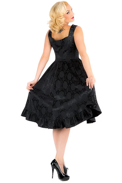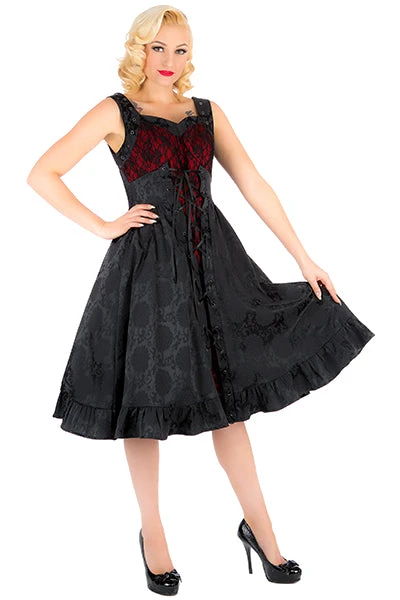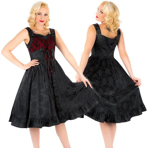 Ladies Flocked Black Brocade Red Contrast Mia Dress from Hearts and Roses London.