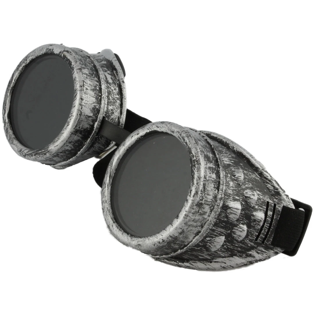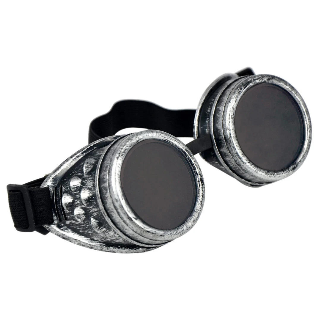Find Steampunk Goggles. Steampunk Black Goggles with distressed Silver Contrast with Adjustable Elasticated Band. Features Spiky Nodule Detailing on the sides This fabulous fancy dress accessory would look great adorning any Steampunk Hat for a little extra Victorian Time Traveller Flare!