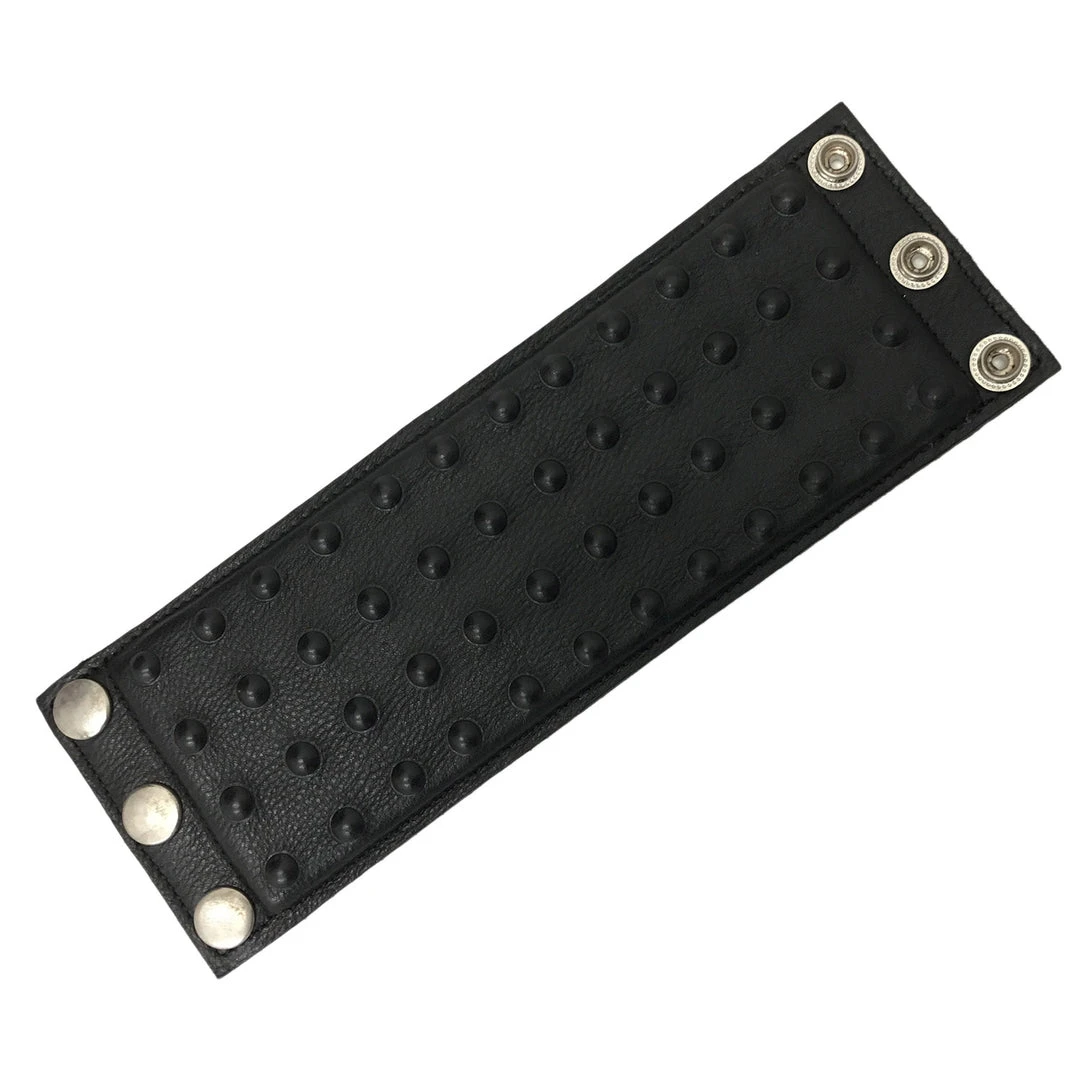 High quality padded black leather wristcuff with three silver tone press stud fasteners and stud design.