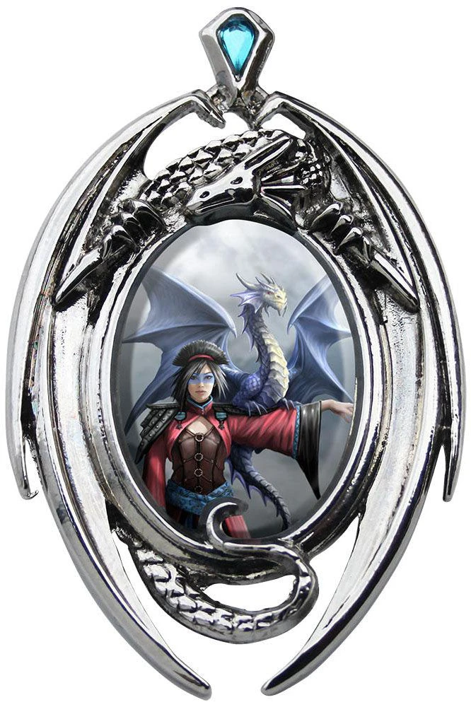 Beautiful winged dragon casted cameo features purple inset faceted diamond shape manmade crystal and Anne Stokes classic ‘Look To The East’ artwork. Comes on a black satin 16″ inch ribbon with 1″ adjustable chain at the back and in a black card square presentation box with clear window.