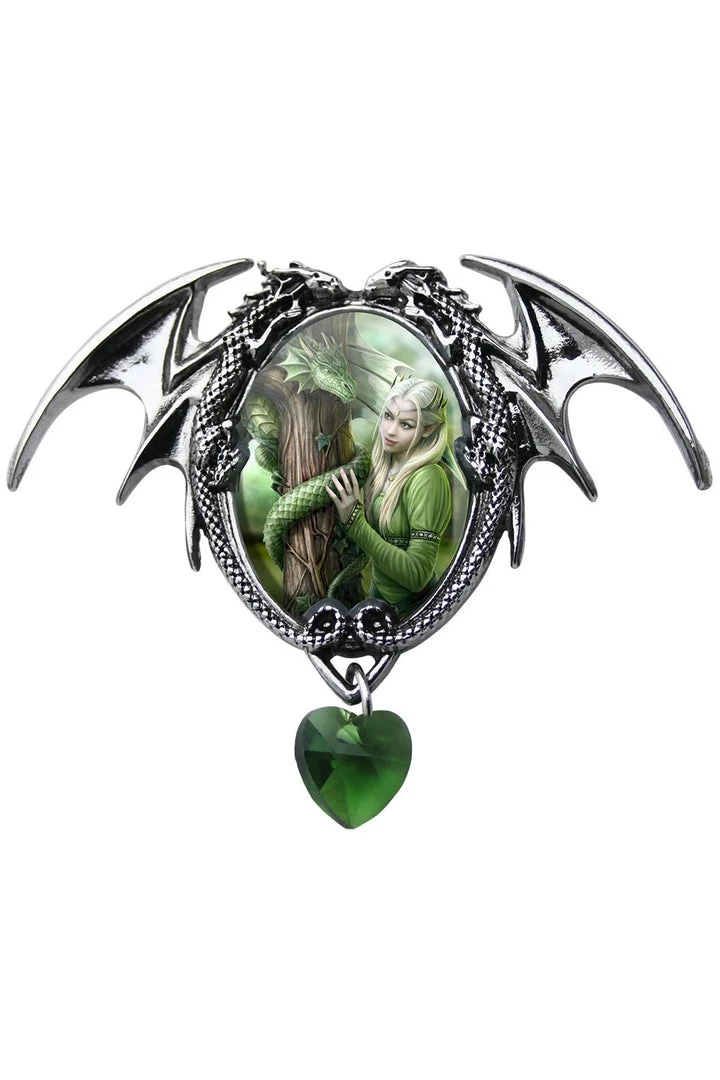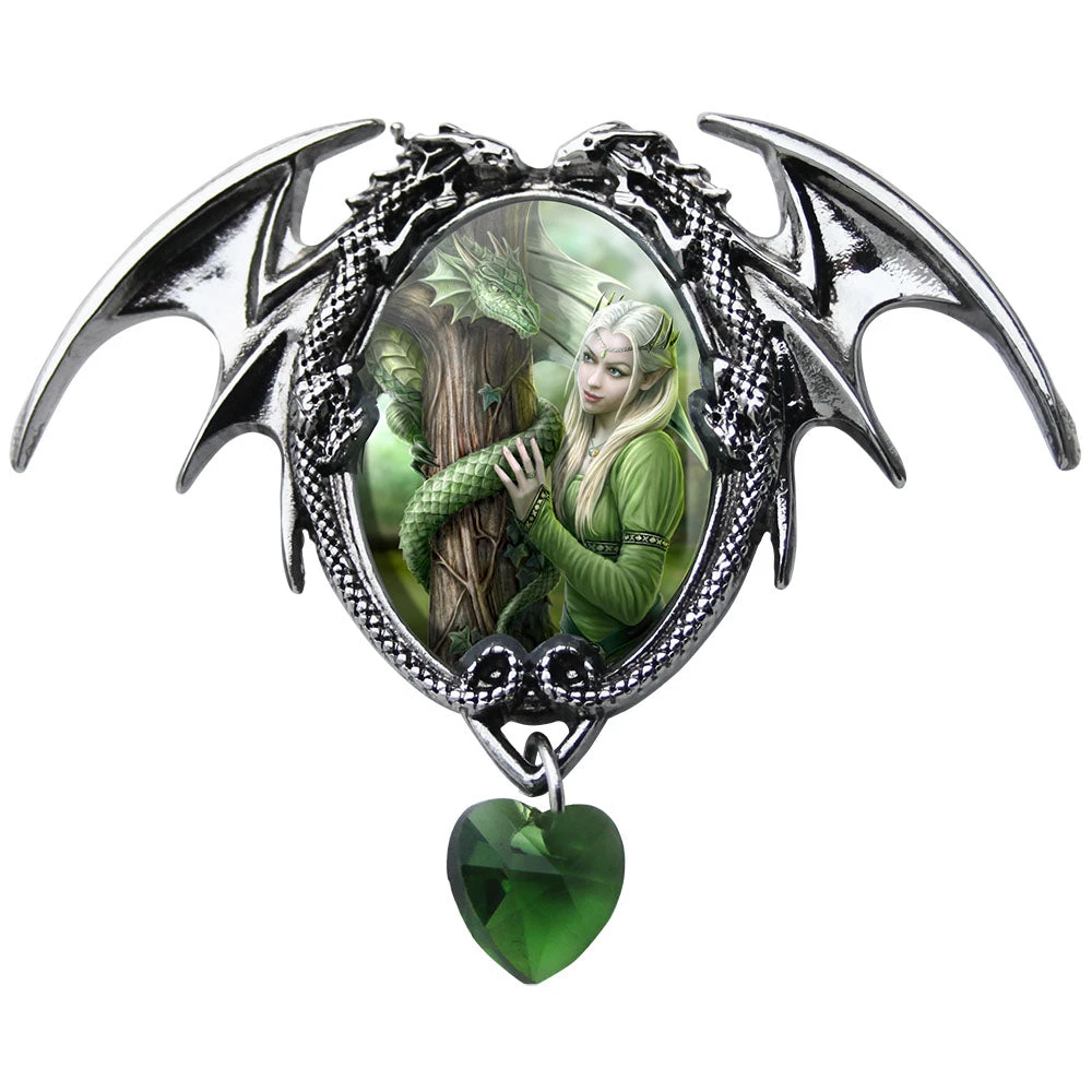 Beautiful double winged dragon cameo features ocean blue faceted heart manmade crystal dropper and Anne Stokes classic ‘Kindred Spirits’ artwork. Comes on a black satin 16″ inch ribbon with 1″ adjustable chain at the back and in a black card square presentation box with clear window.