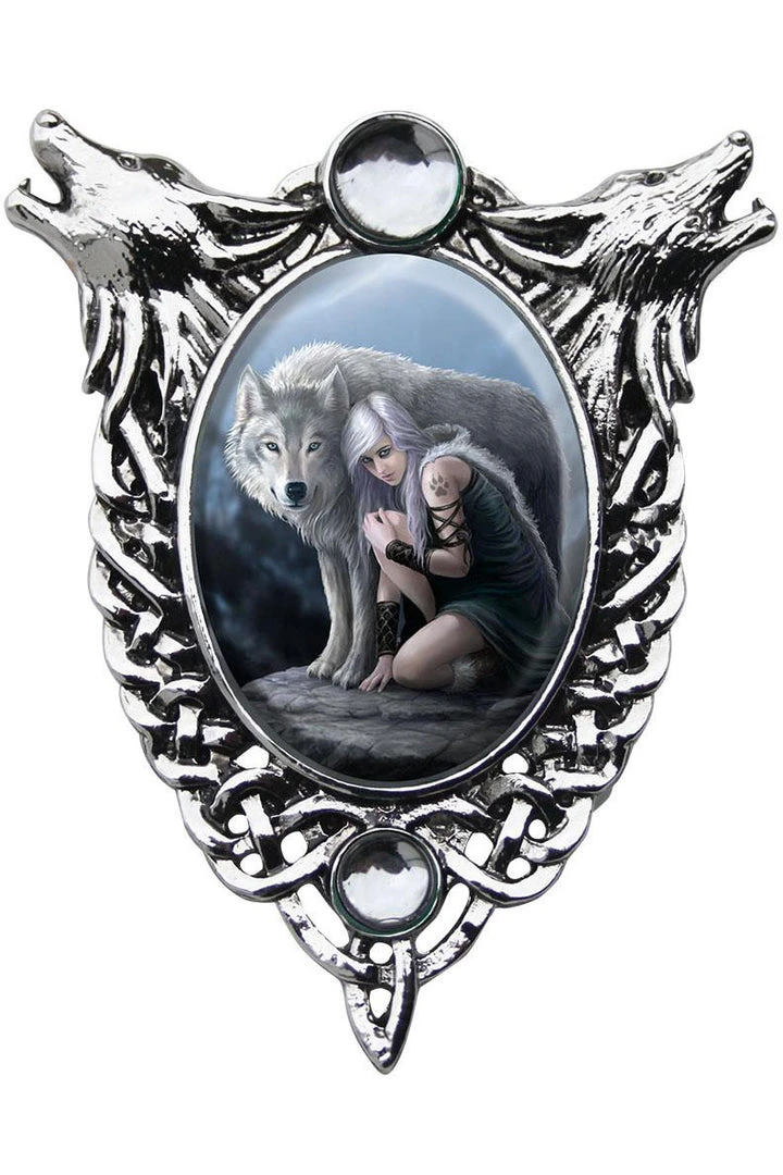 Beautiful double howling wolf with Celtic knotwork cameo features two round dome manmade crystas inset into the cameo and Anne Stokes classic ‘Protector’ artwork. Comes on a black satin 16″ inch ribbon with 1″ adjustable chain at the back and in a black card square presentation box with clear window.