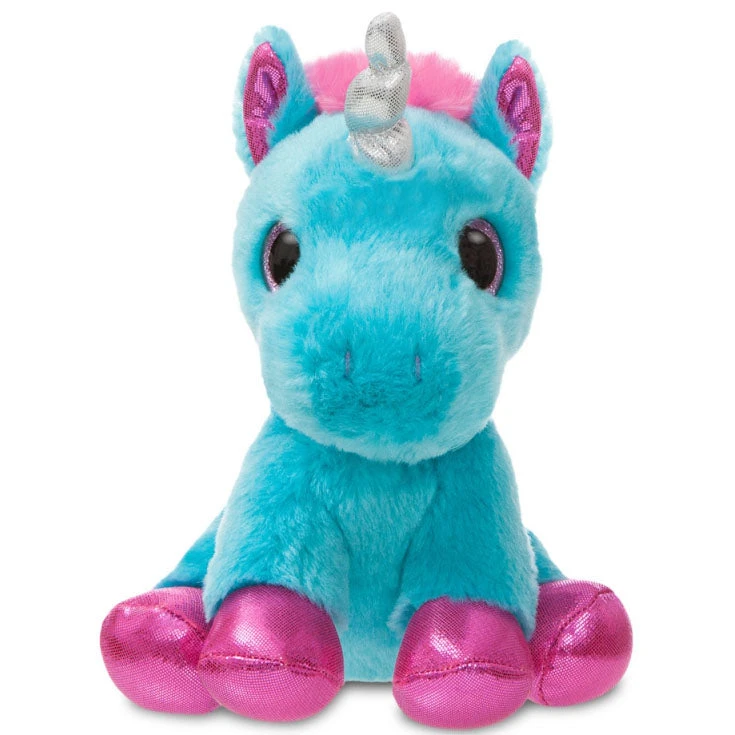 This super cute soft unicorn in turquoise blue has glittery pink hooves, silver unicorn horn and fluffy pink mane and tail. Moonbeam’s eyes are big and sparkly with pale pink glitter.